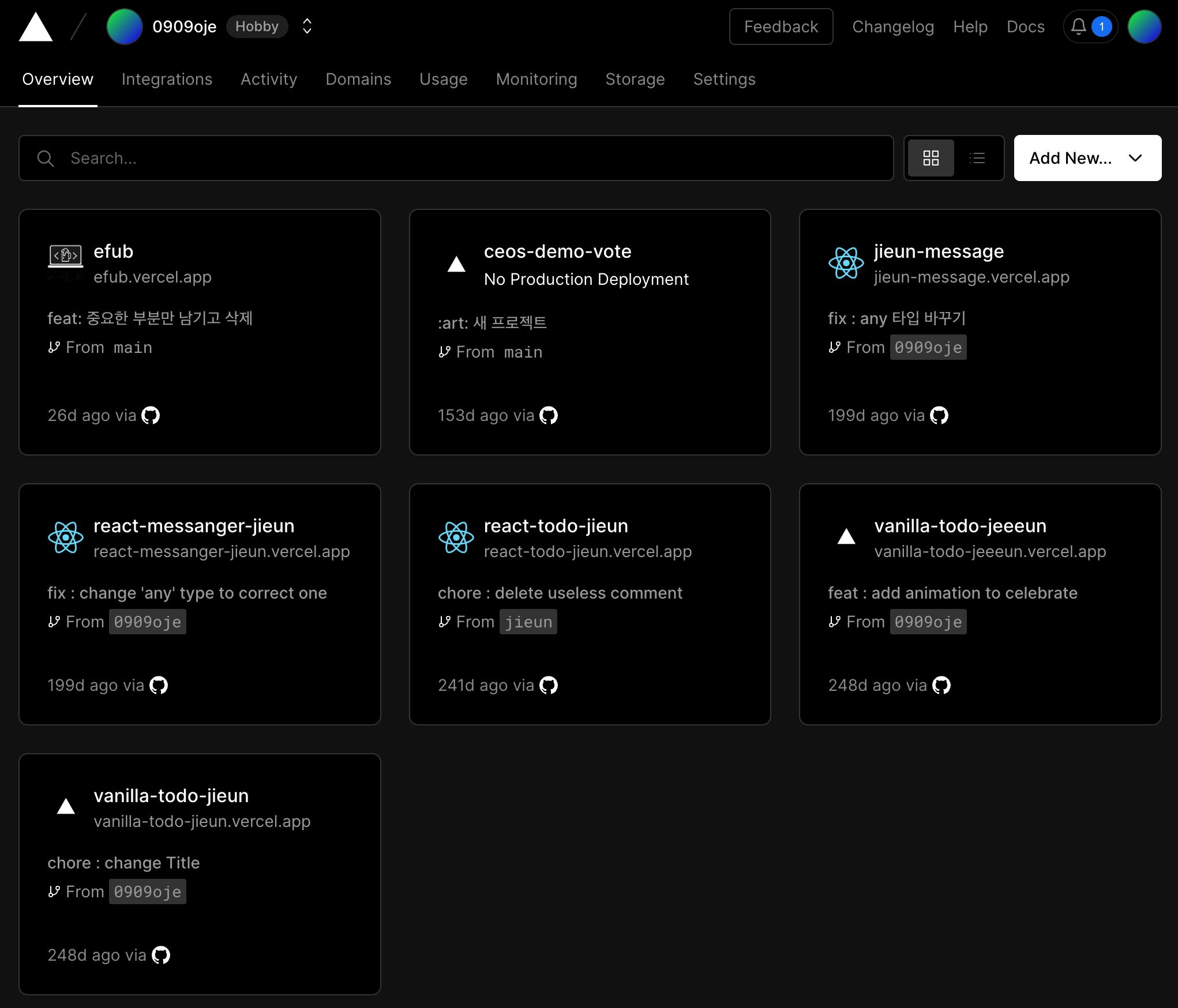 보다시피 UI가 아주 간결하다. 새로운 배포를 하고 싶을 때도 Add New를 눌러서 원하는 레포랑 연결만 하면 CI/CD를 알아서 구축해준다.